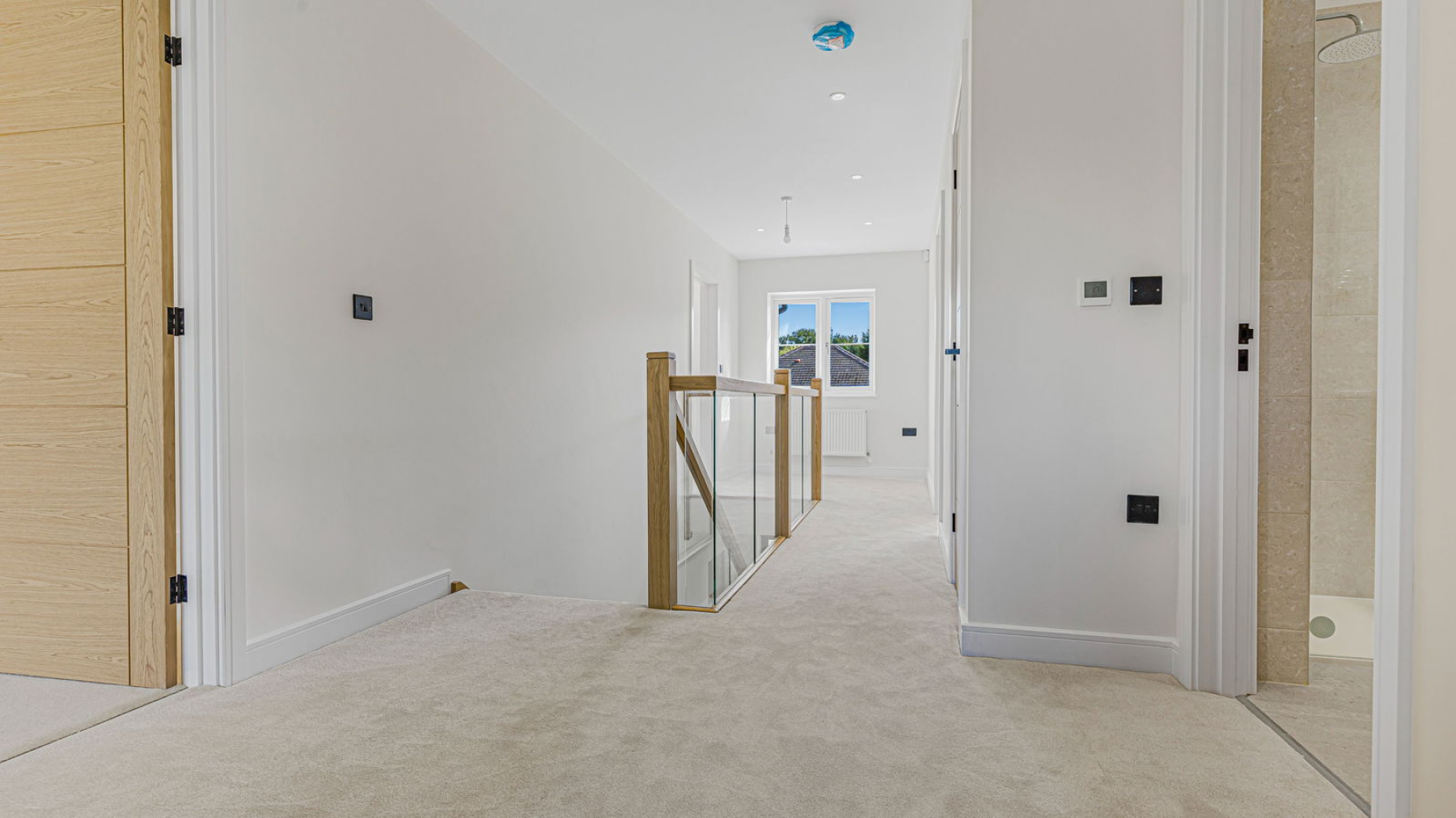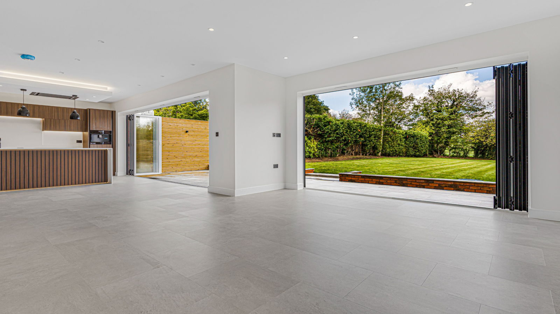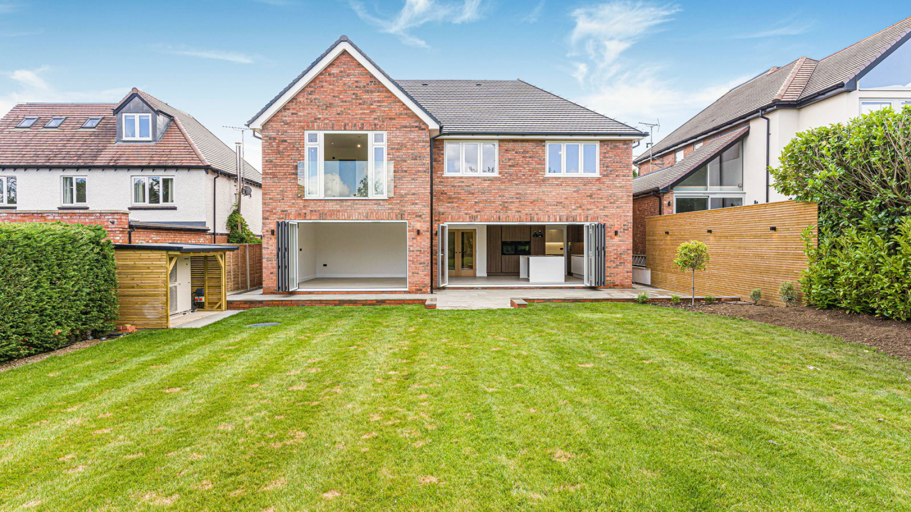 This striking new-build home has been constructed to an uncompromising standard, with a focus on detail and longevity. Energy-efficient features include warm air source heating and underfloor heating to the ground floor, enhancing both sustainability and everyday comfort. Throughout the property, premium finishes have been carefully curated—ranging from bespoke cabinetry and a made-to-measure kitchen, to high-spec Porcelanosa bathrooms and expansive glazing that invites light and nature into the heart of the home.