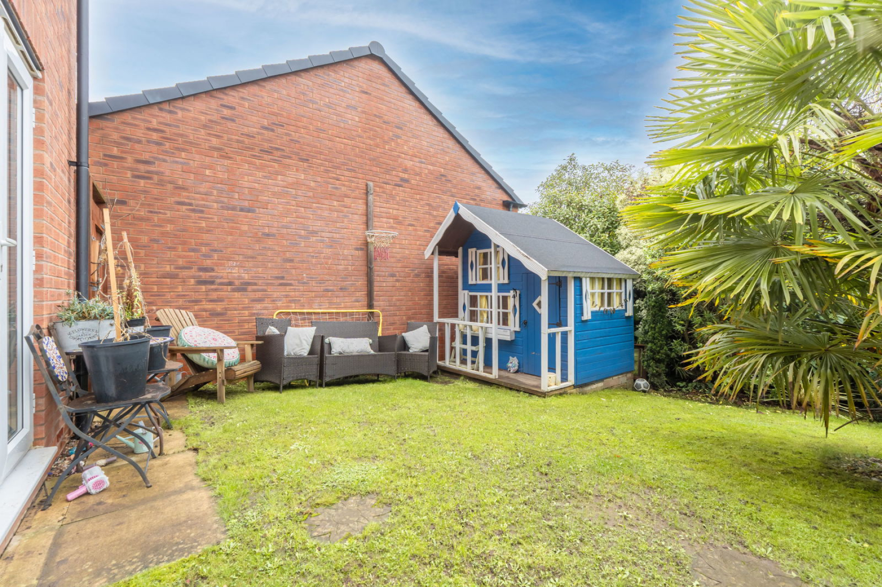 Outside, the property features a double driveway leading to a large detached garage—once used as the show home office—offering excellent flexibility and storage. Behind the garage and at the rear of the garden, you’ll find additional concealed storage areas, adding practical functionality without compromising aesthetics.