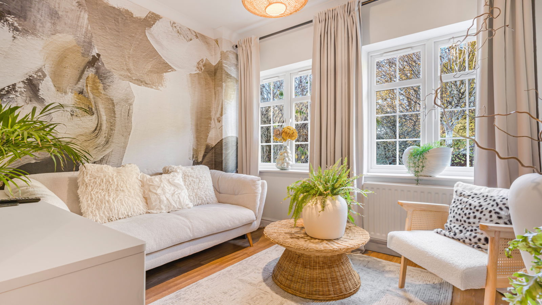 The south-facing rear garden has been thoughtfully landscaped to create an inviting setting for relaxation and outdoor entertaining, offering well-stocked borders, mature planting, and a well-tended lawn.