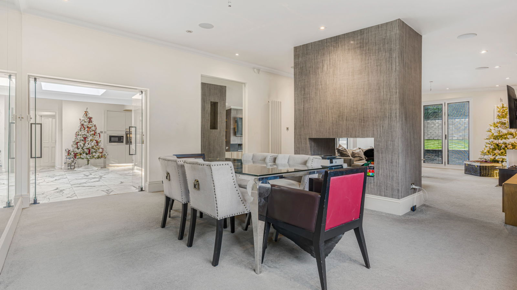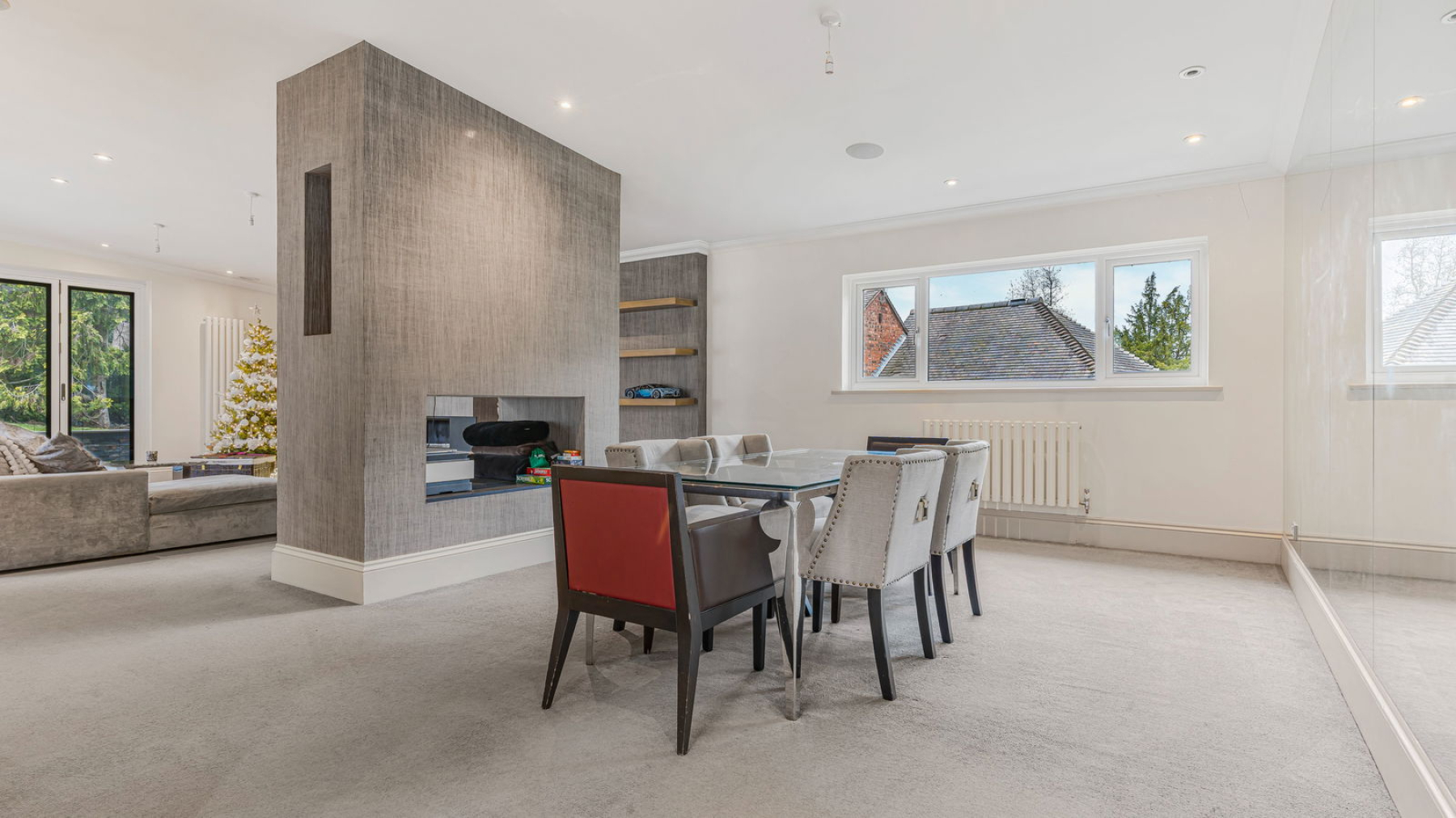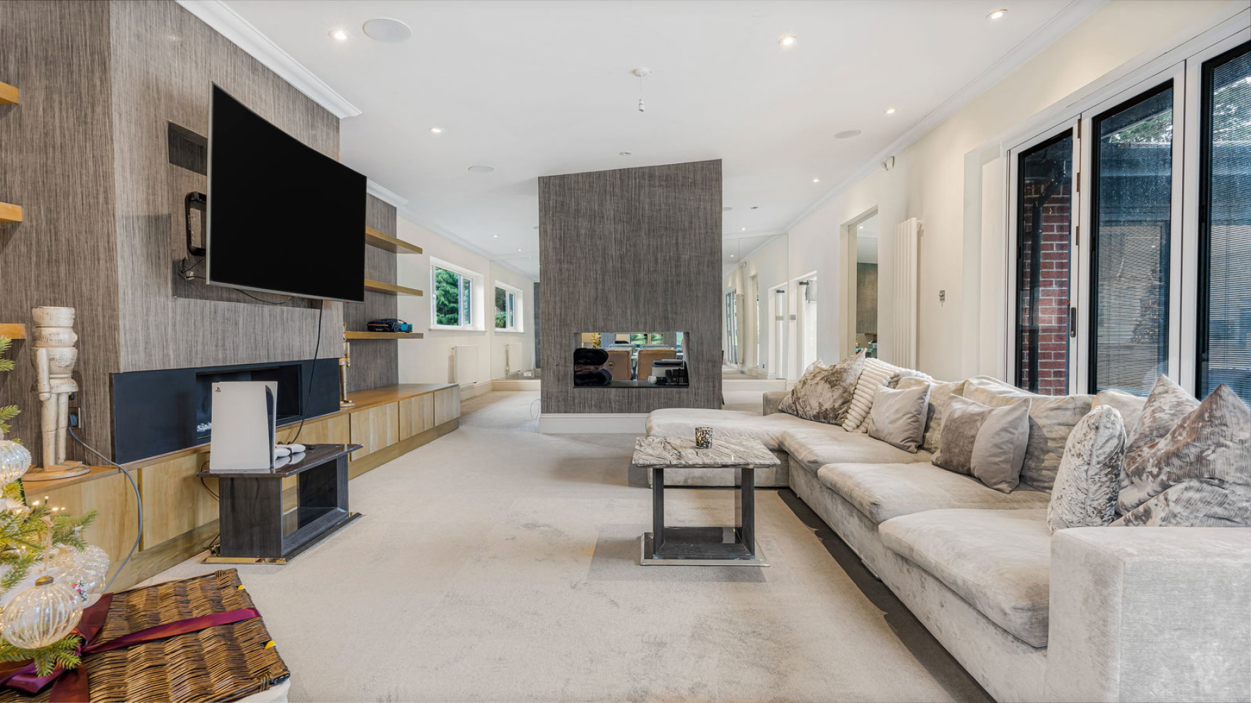 To the right, the Lounge/Dining Room perfectly embodies modern open-plan living. Generously proportioned and versatile, it is well suited to both entertaining and relaxation. A striking dual-aspect feature fireplace provides a dramatic focal point and subtly defines the two areas, adding character. Two sets of bi-fold doors open directly onto the landscaped rear garden, seamlessly linking indoor and outdoor living and making the space ideal for social gatherings and alfresco dining.