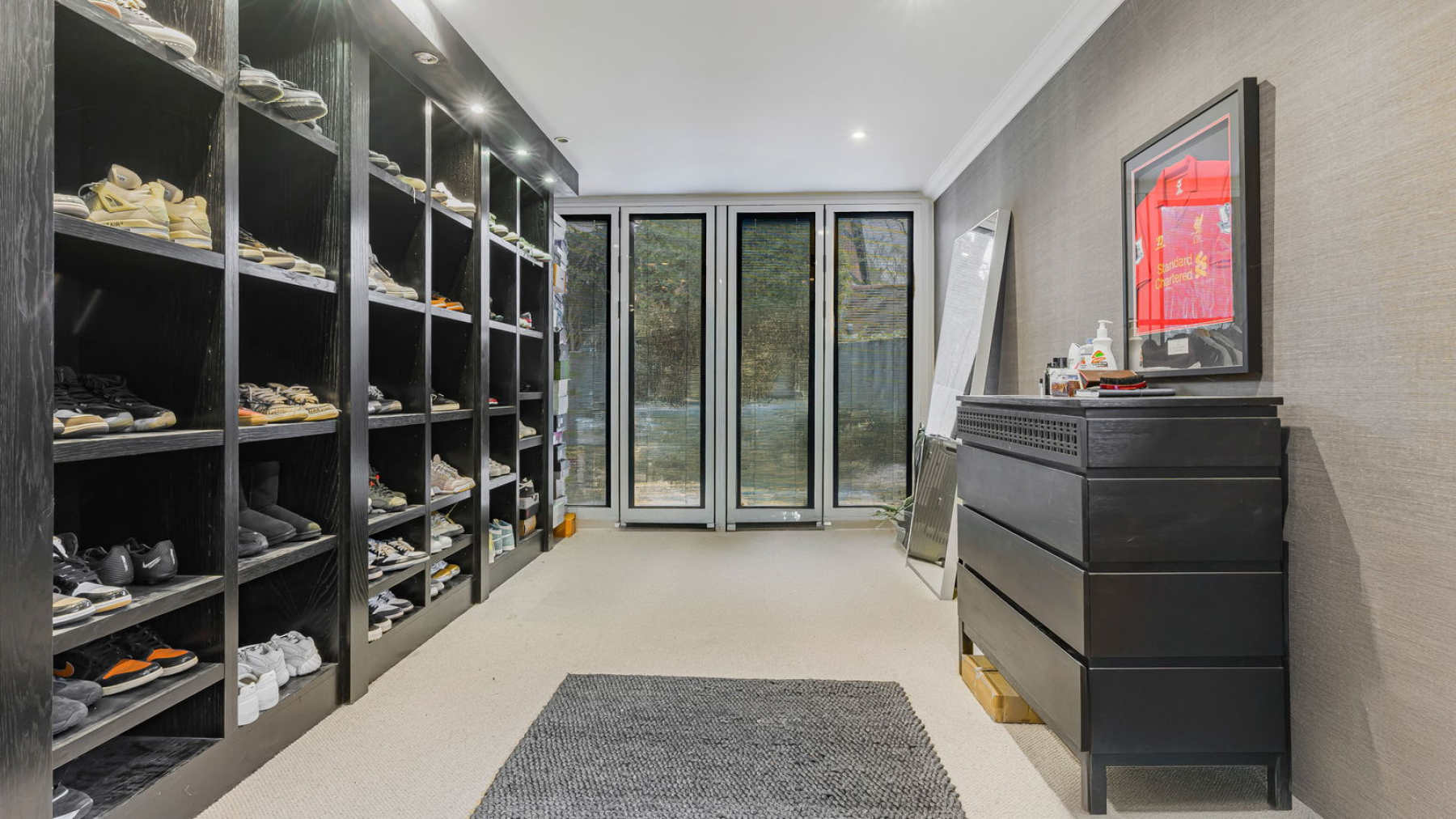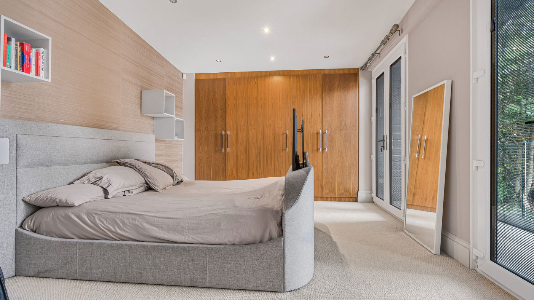 Occupying the left wing of the property are three further double bedrooms, each thoughtfully designed with bi-fold doors opening onto a private patio area. All benefit from fitted wardrobes, offering excellent storage. One bedroom has been cleverly converted into a bespoke dressing room with custom cabinetry and shelving, though it can easily be reinstated as a fourth bedroom if required.