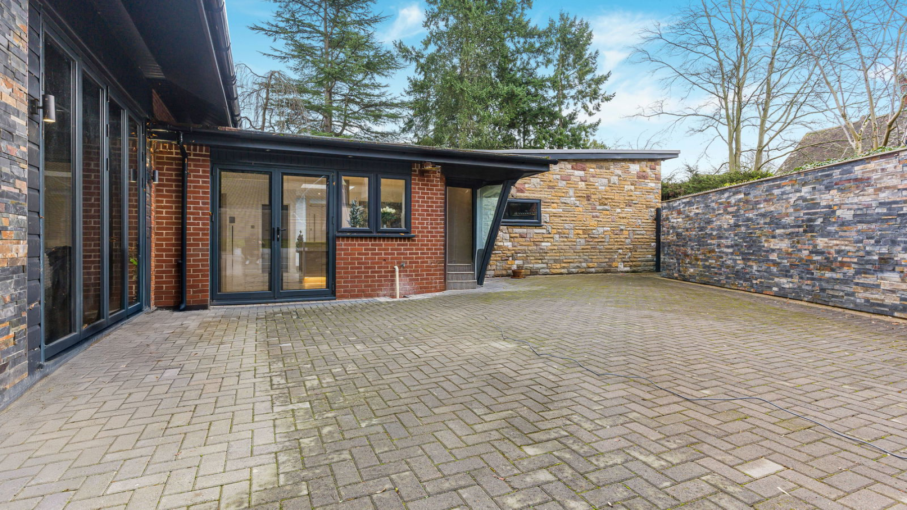 Blending contemporary style with practical family living, this impressive four-bedroom residence is approached via intercom-controlled gates leading to a sweeping driveway that provides generous parking and access to the integral double garage. The thoughtfully planned exterior spaces complement the home’s bold architectural design, creating a secluded and elegant setting in this highly desirable village location.