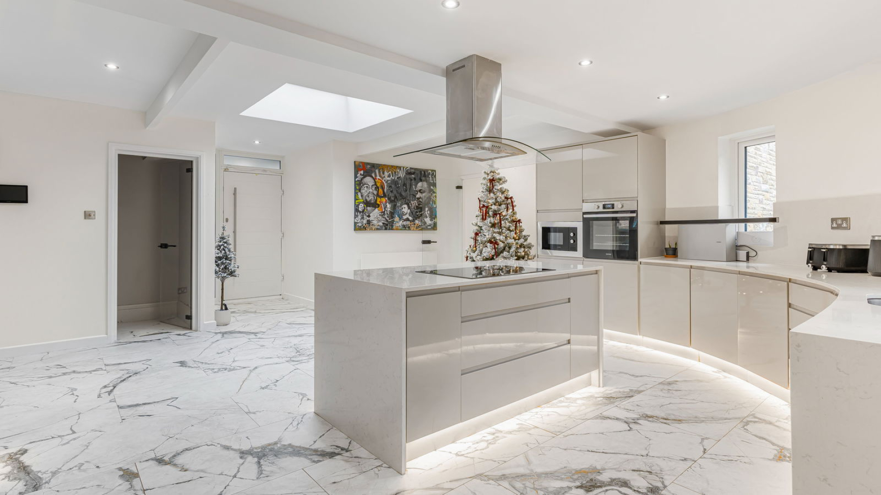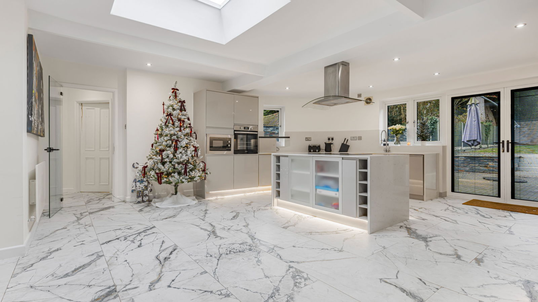Steps rise to the main entrance, opening into the centrepiece of the home: an exceptional Kitchen/Breakfast Room, comprehensively refitted in 2021 to an outstanding standard. Designed for both everyday living and entertaining, the space features a sleek central island ideal for preparation or informal dining, alongside premium integrated appliances including a double oven, induction hob, fridge-freezer and dishwasher. A large skylight bathes the room in natural light, enhancing the sense of space and airiness.