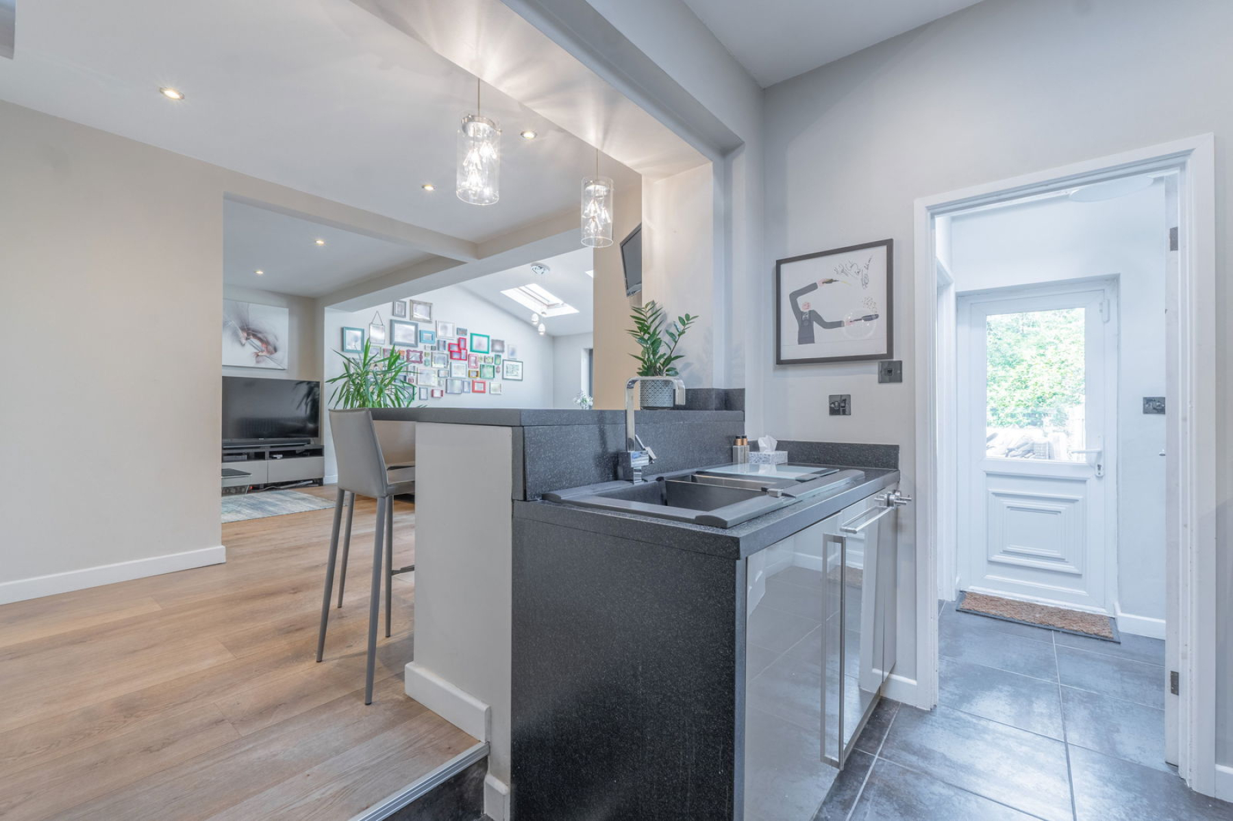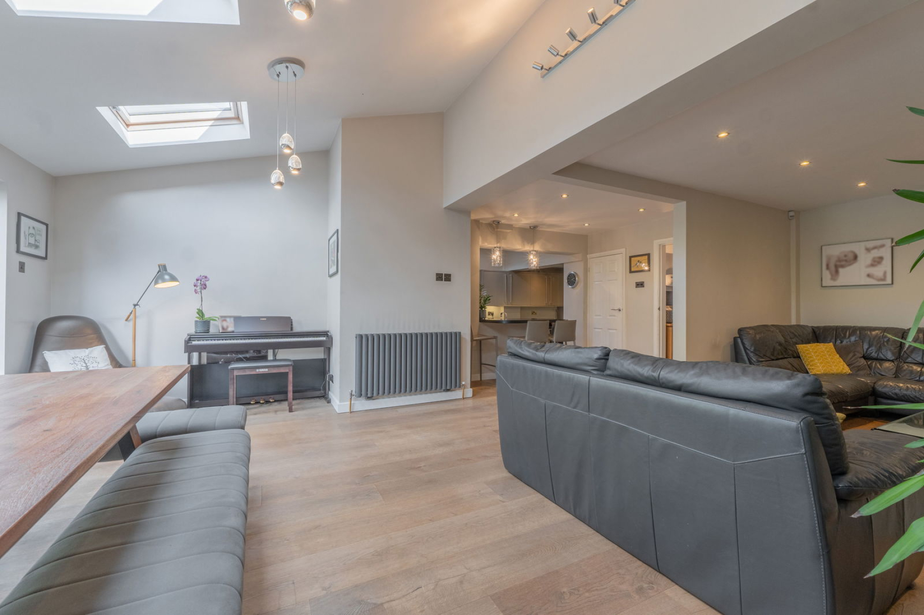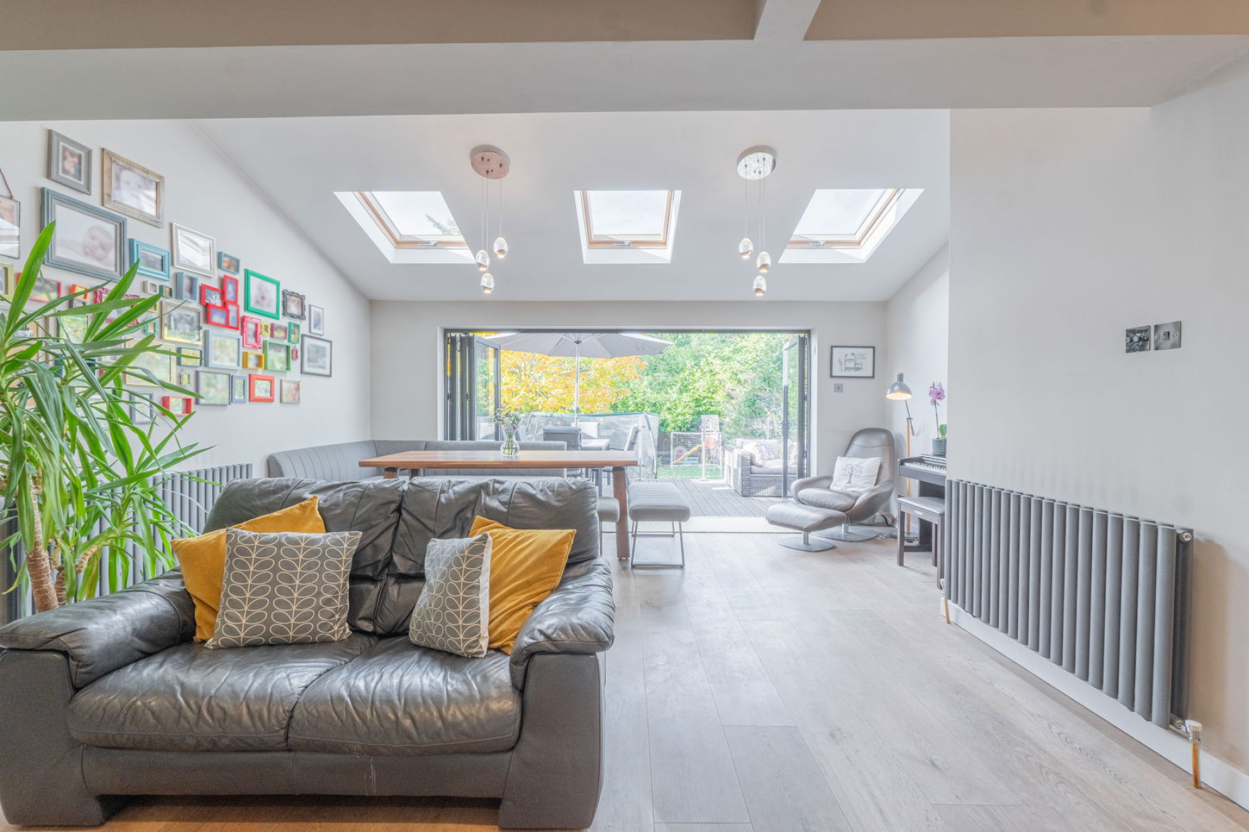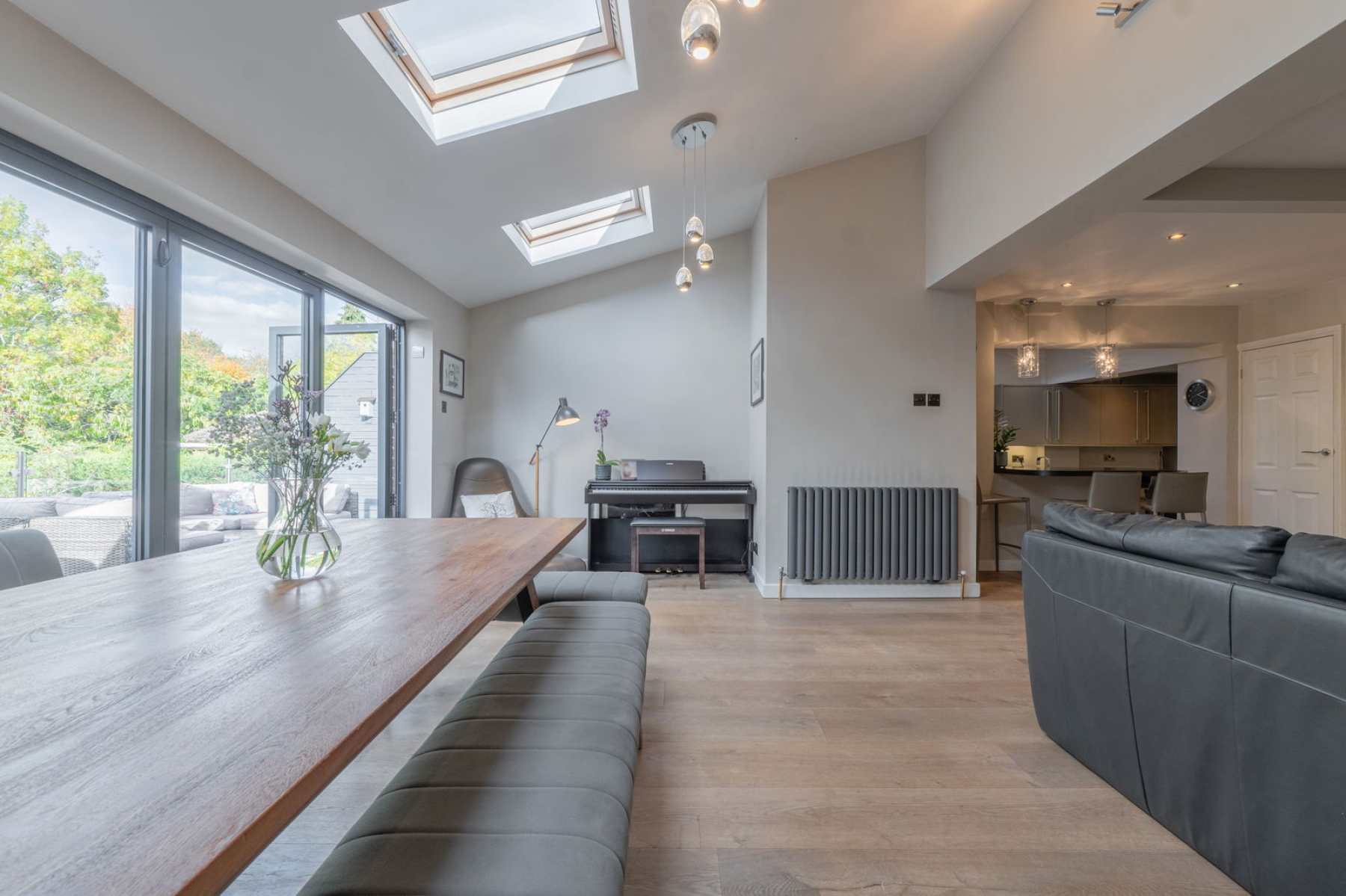 At the heart of the home lies the open-plan kitchen, dining, and lounge area — a truly stunning space ideal for entertaining and relaxing. The modern kitchen is equipped with sleek cabinetry, integrated appliances, and a breakfast island that seamlessly flows into the dining and lounge zones. Large bi-folding doors open out onto the garden, flooding the space with natural light and creating a perfect indoor-outdoor connection.