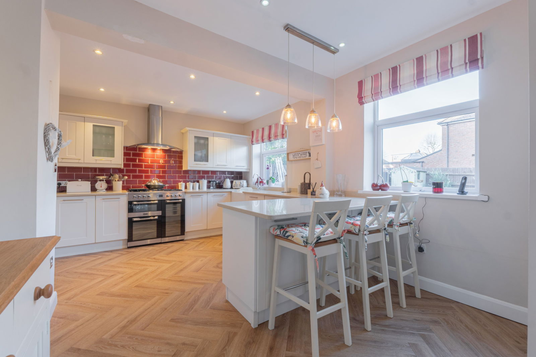 Upon entering the property, you are greeted by a welcoming hallway that provides access to the principal ground-floor rooms. At the front of the home is a bright and spacious lounge featuring a large bay window, offering an elegant space for relaxing and entertaining. To the rear, the property opens out into a superb extended dining kitchen—one of the standout features of this home. This impressive open-plan area benefits from excellent natural light and provides ample space for family dining, social gatherings, or day-to-day living. The kitchen itself is arranged with generous worktop areas, modern units, integrated appliances, and a layout designed with practicality in mind.